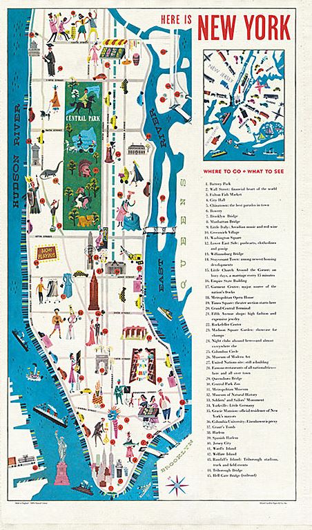 1950s embroidered cartoon map showing NYC landmarks | New york